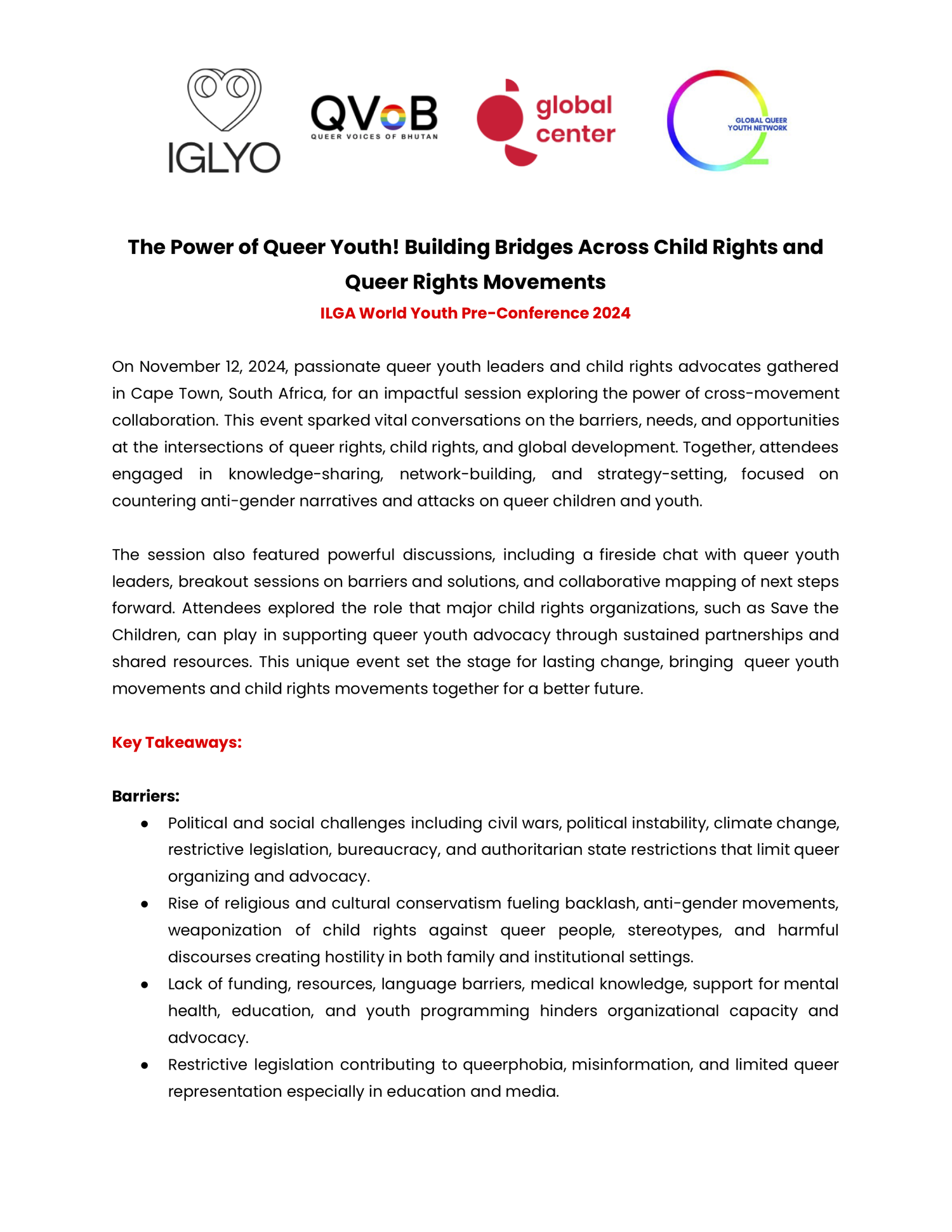 On November 12, 2024, passionate queer youth leaders and child rights advocates gathered in Cape Town, South Africa, for an impactful session exploring the power of cross-movement collaboration. This event facilitated vital conversations on the barriers, needs, directions, and opportunities at the intersections of LGBTQI+ rights, children’s rights, and global development. Together, attendees engaged in knowledge-sharing, network-building, and strategy-setting, all focused on countering anti-gender narratives and attacks on LGBTQI+ children and youth.